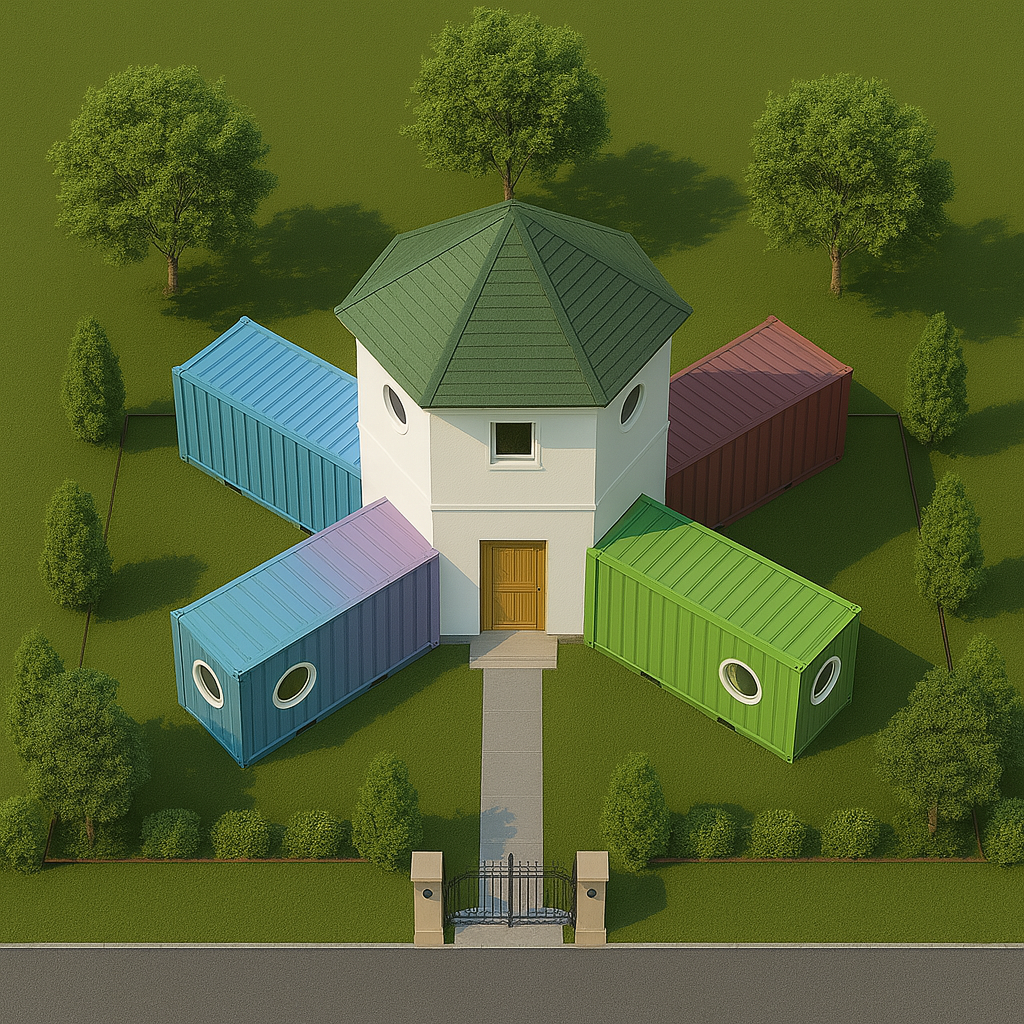 こんな風に真ん中の家に、キッチン・お風呂・トイレなど集約させて「コアハウス」をしっかり建築確認申請して合法的建てて、その周りに「置くだけコンテナ」の、リビング、寝室、子供部屋を設置。