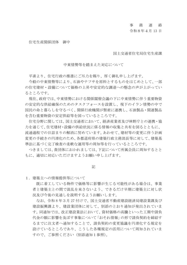 今回もコロナの時と同じで国交省から4月13日付で、一部設備未設置や建材変更がある場合でも、完了検査を柔軟に運用するよう通知が出ている
