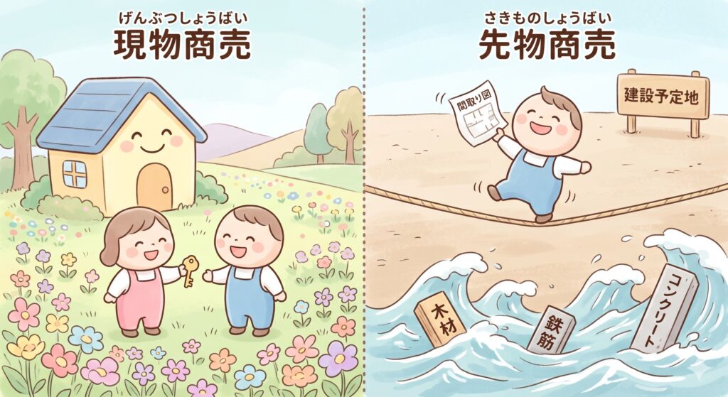一方、注文住宅は紙っぺら間取り1枚で契約して、あとから仕入れて建てて利益を確定する。 これ、、信用売りや先物取引と同じ構造なんです。