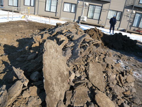 8時出社、、インクジェットプリンターに年賀状の印刷をさせたまま、美幌の現場に行く。道中は舗装が出ていて走りやすいけど、日陰はアイスバーンがあったりで、絶対に気が抜けません。無事現場に到着、今日から基礎工事が始まっているわけで、掘削を立ち会う。予想では凍土が30センチの厚さはあると覚悟していたが、10センチ程度しか凍っていなくて良かった。右の写真は凍った土を掘り起こしたところ、、とても良質な火山灰だったのでもったいないけど、凍っていては使えないので捨てるしかない、、美幌は地質や水はけの悪いところが混在しているんだけど、調査の結果通り実際もこの土地は大丈夫。安心、安心。北見に戻る時はずっとパトカーが先導してくれて、安全運転で帰れた。