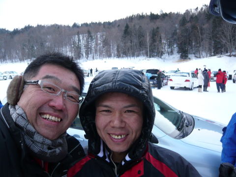 ということで自分の走行番までまったりとしていると、なんだかどこかで見たことのある、お兄さんがいるではないか、う~む、、、、、あっ!!大変だ!あまりの厚着で気が付かなかったが、なんと超大人気!プロドリフト選手権(以下D1)の吉岡選手じゃないですか、、、いやいやナンで??そして、昨日のカメラ陣の正体は、自分が毎月26日楽しみに買っている「ビデオOPTION」の人たちではないですか、、何度かここでも書いた事があるように、あと10歳若くて才能があれば、絶対こっちをやりたかった。今更どうにもならないけど、、、でも、ナマでまさかこんなところで会えるとは、なんとツィいるではないでしょうか。こん時だけはタダのミーハーなファンのおっさんなわけで、写真も一緒に撮っていただいたりで、ニコニコ♪、、