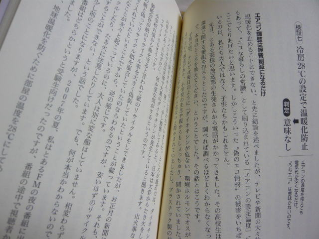 北海道はサミットの真っ最中なわけで、eco、eco、eco、eco、と耳にタコが出来るくらい世の中は大騒ぎ。でも、本当のecoって何なのか?もしかして本当はみんなテレビや新聞に踊らされてはいないのだろーか。。この本を読むと「マイ箸」「エコバック」等も微妙だと書いてあった。それが正しいかわかんないけど、世の中の雰囲気と逆な事を調べるのも、それはそれで面白いし勉強になる。。