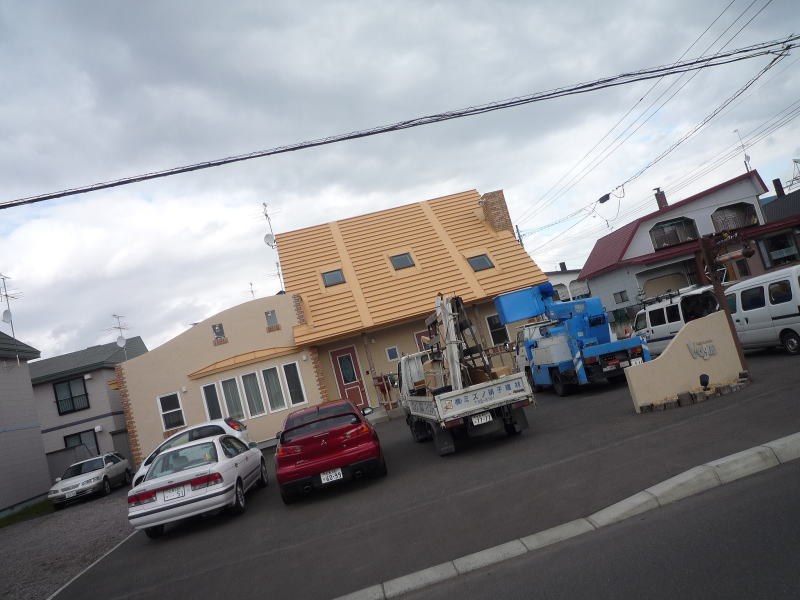 続いて3年経過の美幌の美容室兼理容室兼住宅の現場に協力業者さん共々大移動。。こちらは特に問題なし。屋根が若干複雑な部分があるので、板金屋さんはその部分を入念にチェックしていた。屋根のニセ煙突に付いたライトアップ用の電気の球が切れていて、電気屋さんが高所作業車を使ってあっという間に交換、、キッチンのカウンターに置いてある電気ポットのコンセント用に、カウンターに穴あけサービスとか、エボホームの社長があっという間に作業終了。代金無料。。