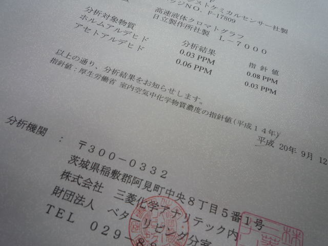 と言う事で、ネットで調べまくりとか、分析してもらった会社に電話して色々聞いたりとか。凄く長時間にわたり丁寧に教えていただきありがたかった。まぁ、結果的にアセトの濃度はあまりというか全然気にする必要は無く、全く心配ないですけどね。何たって業界では有名な話ですが、こんな記事とか、これやこれやこれをお読みください。住宅の品確法の「特定測定化学物質」には当初アセトも入っていたんだけど、その指針値はWHOの定める数値より少し低めに設定する感じだった。んで、ホルムは0.08ppmアセトは0.03ppmなどと決められたのだけど、何と何故かどうしてかこの人がそうなると困るのか?事故米と関係あるのかわかんないけど、林野庁が再度WHOに問い合わせたら、0.03ppmは間違いで0.17ppmが正しいとの回答を得たと、国交省に申し出てこりゃあかんとなって、アセトは特定測定物質から除外された。