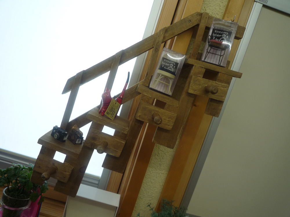 そう言えば話は変わるけど、写真のコート掛けみたいな木のオブジェ素敵でしょ。。この前雑貨屋さんから買ってきたのだけど、この手作り感がホントいい感じ♪。。こんなのくらいエボホームなら簡単に作れるときっと思われるでしょうけど、この何ともいい加減な手すりの傾きとか、段々が一段ずつ角度違うとか、木と木がちゃんとくっついていなくてスキマがあるとか、この感じがプロには作れないのですよ。。どうしてかって、プロなら「へたくそ」と笑われるから。。キッチリしか作れない不器用な感じ。。