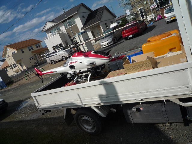 現場の前で何やら小さいヘリコプターが積んであるトラックを発見!、、好奇心の固まりのおっさんとしては直ぐに駆け寄り、いろいろ突撃インタビューをした。農薬散布に使うらしいこのヘリコプターは、何と!!1000万円。。それも完成品ではなくプラモデルのようにバラバラで購入しての価格とこと。いや~ビックリ。