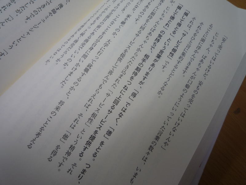 「秋」と言えば、食欲の秋、読書の秋、スポーツの秋等と言われますが、皆さんはどんな秋を過ごすのでしょうか、、、自分は本が大好きで、今年は少し少なめなペースですが、週一冊ペース位で、ジャンルを問わず色々な本を読みます。本日読み終えたつんくさんの本ですが、結構面白かったです。シングルベット誕生の秘話、ヒット曲を作るコツなど、自分の仕事に生かせる事がいっぱい書かれていてタメになりました。中でも印象に残ったフレーズは、大阪で商売をやっているつんくさんの、おじいちゃん、おばあちゃんが口癖のように言っていた言葉、、「安くは売っているけれど、安いものを売ってはいけないんや」、、、なるほどホントその通り。。