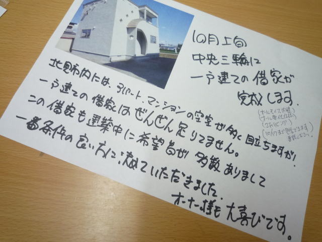 実はある機関にお願いしてあった「うらえぼ」に同封する予定の資料が届かなかったので、急遽5分で作ったメチャクチャこ汚い字で書いた借家の現場の完成報告のチラシを見て、興味を持ったみたい。しかし何に興味を持つかは予想できないものです。。よ~く考えてみれば、今回完成した借家のオーナーさんも、13年前に自分からマイホームを建てていただいた方なわけで、そう考えればありえる話なんだと思ったり。と言う事で現場を案内する事に、、、ほぼ同時の時間にネットで見ていた他のお客様も借家を見たいと連絡が入り、現場で待機してプチプチ内覧会になってしまった。現場で色々雑談、、はい!大丈夫、、任せてください。まずは掘り出し物の土地探しから始めましょう。。2軒目なのだから少しは信用してくれているはず??