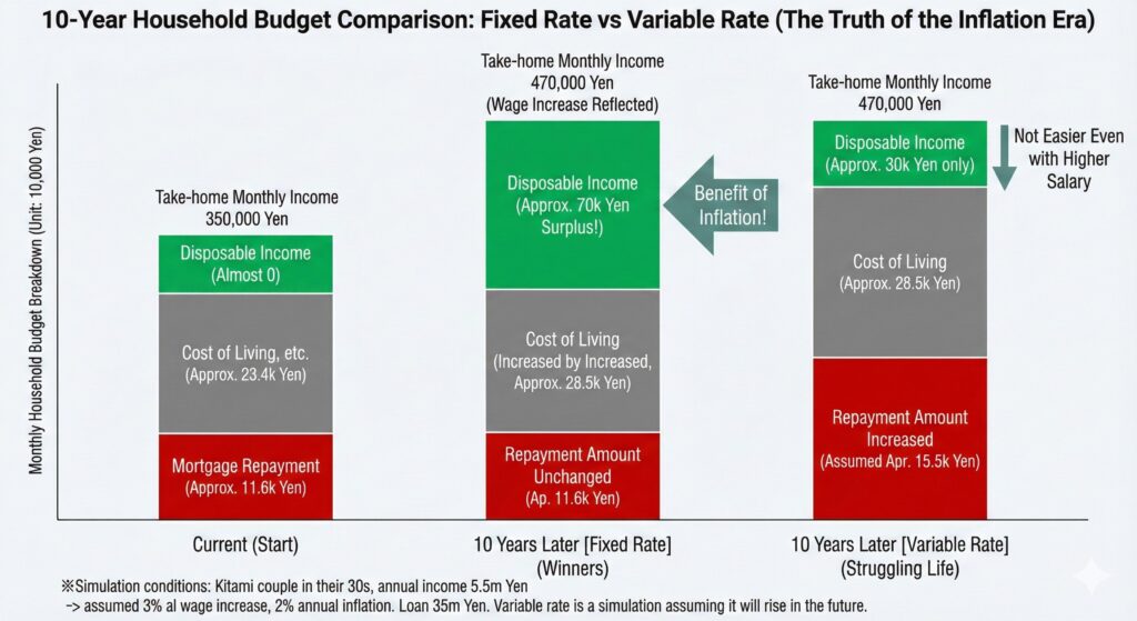 Look at the middle bar graph. This is the figure of the winners who maintained “the current fixed rate (2.0%).” Assuming a household in Kitami in their 30s with an annual household income of 5.5 million (take-home 350,000), and assuming wages rise by 3% and prices rise by 2% in the future. In 10 years, take-home pay will increase by 120,000 yen, but the cost of living will also increase by 50,000 yen due to high prices. However, with a fixed interest rate, the loan repayment amount remains 116,000 yen. As a result, a margin of 70,000 yen per month is created.