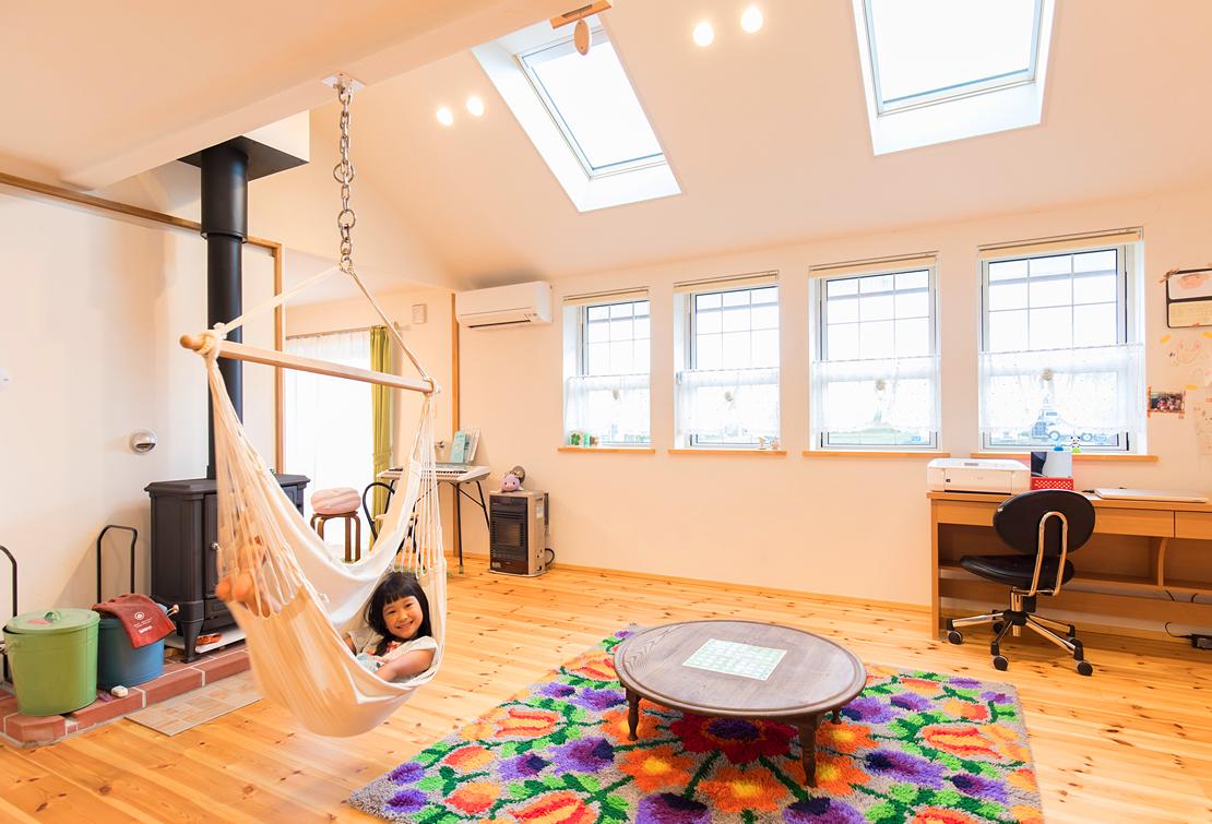 ハンモックに座って見る薪ストーブの火、天窓からのお月さま